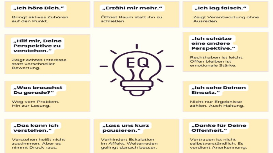 Deine Fähigkeit, mit Menschen umzugehen. Mit Druck klarzukommen. Konflikte zu lösen, ohne zu eskalieren. Zuzuhören, wenn andere reden und dich selbst zu regulieren, wenn Emotionen hochkochen. Das ist EQ.
